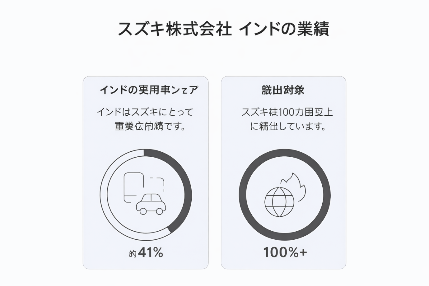 スズキ自動車は、インド投資成功の最も実証的な事例の一つです。インドはスズキの世界販売台数の50%以上を占め、年間約120~130億米ドルの収益を生み出しています。