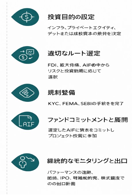 AIFおよびその他の機関投資ルートを通じてインドに投資する一般的なプロセスは以下のとおりです。