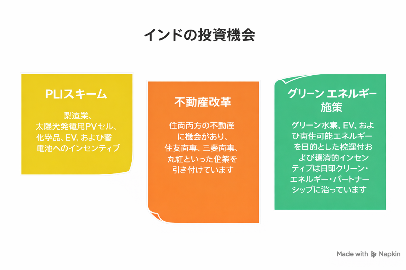 このような取り組みにより、日本の投資家は、インドの成長軌道と日本の専門知識および技術力が交わる分野に、戦略的に資金を投入することができるようになる。